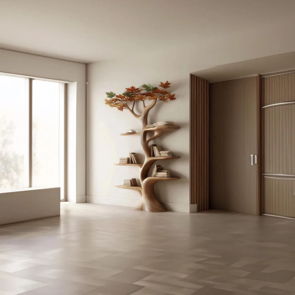 Crafted for homes that favor warm materials and clear lines, this rustic tree bookshelf brings solid wood and sculptural order to the wall. A vertical trunk anchors the layout while branch-like arms create short ledges that hold book stacks at a slight angle, making spines easy to scan and covers simple to display. Mounted to the wall, the piece saves floor space and doubles as wall décor in living rooms, halls, and home offices.